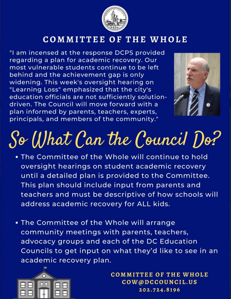 In a post on twitter the week after the February 10 hearing, council chair Phil Mendelson noted that he “is incensed at the response DCPS provided regarding a plan for academic recovery. Our most vulnerable students continue to be left behind and the achievement gap is only widening. This [February 10 hearing] on “learning loss” emphasized that the city’s education officials are not sufficiently solution-driven. The council will move forward with a plan informed by parents, teachers, experts, principals, and members of the community.”