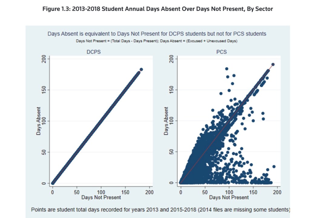 The data points on the chart on the right not aligned with the diagonal line show DC students not consistently accounted for in a way that is actionable OR trackable by OSSE and most LEAs. Those students are thus highly likely to not be receiving the educations they are entitled to–with little hope of help, because there is no systematic and comprehensive tracking of them or their records across LEAs.