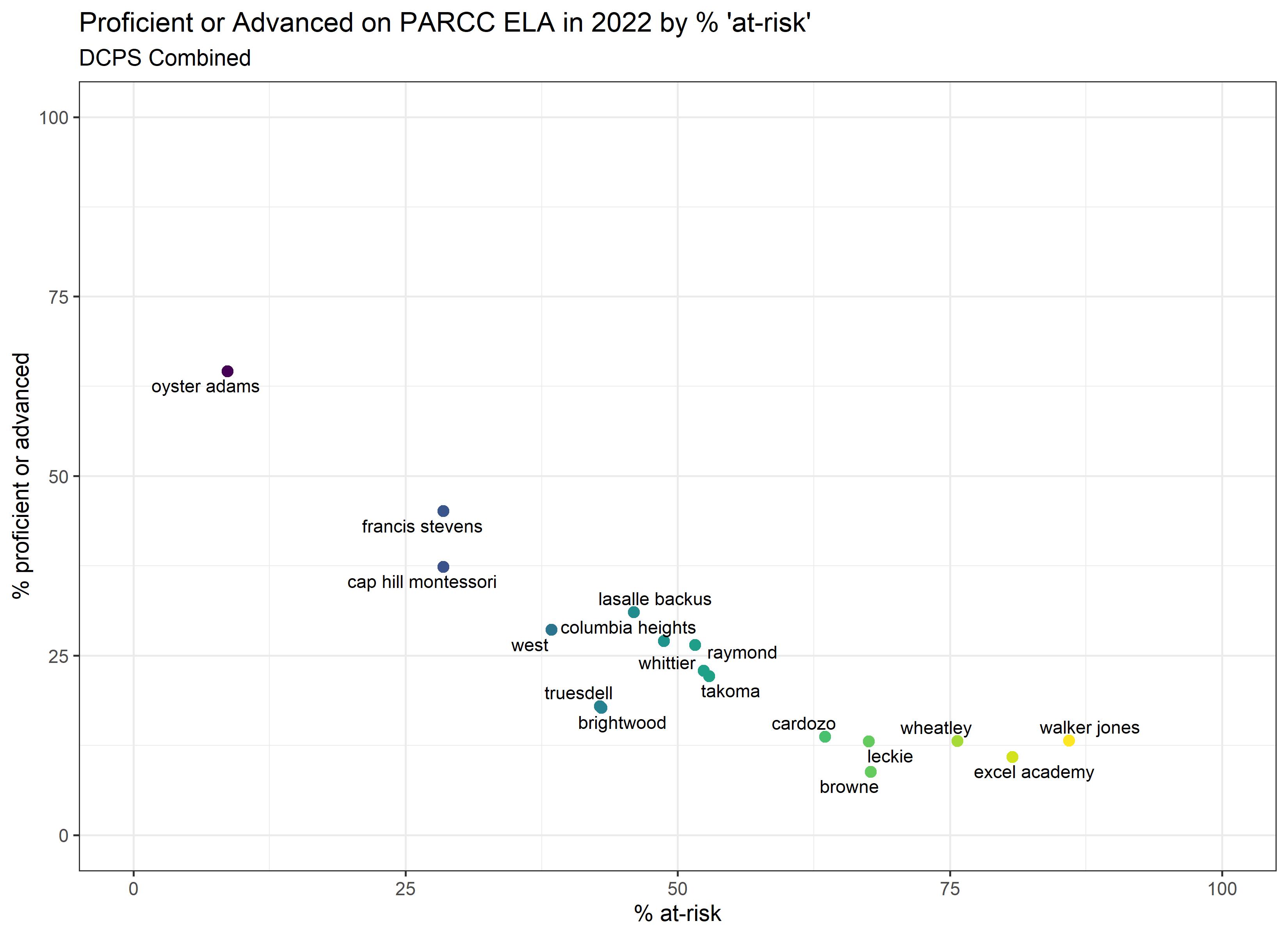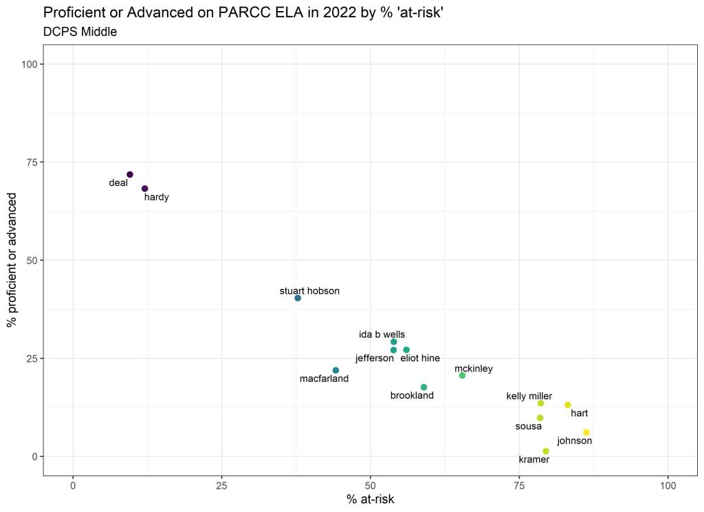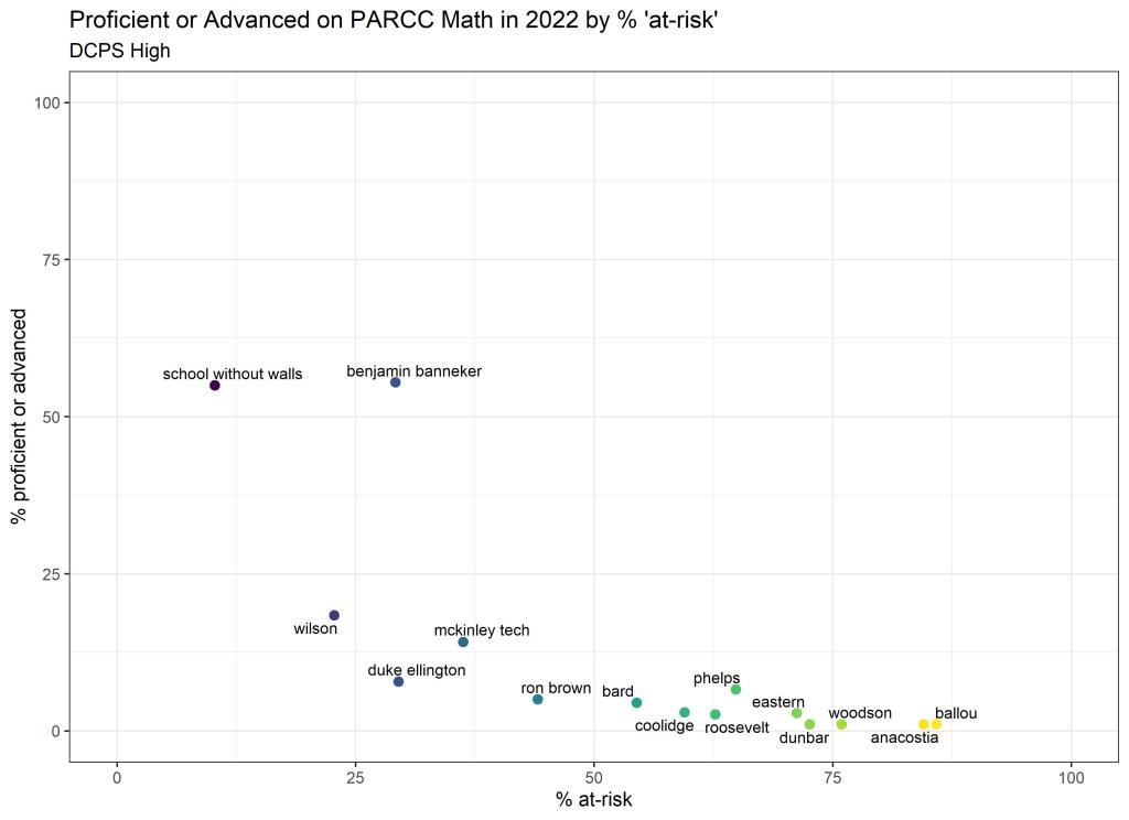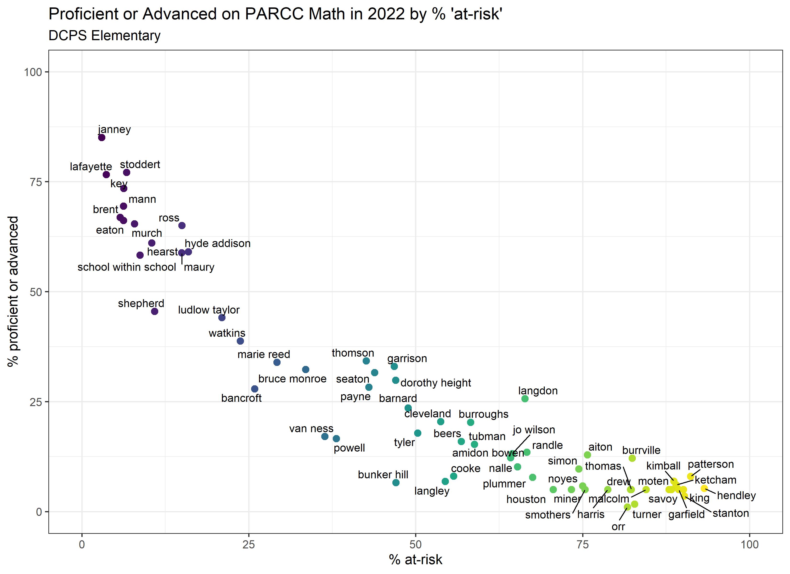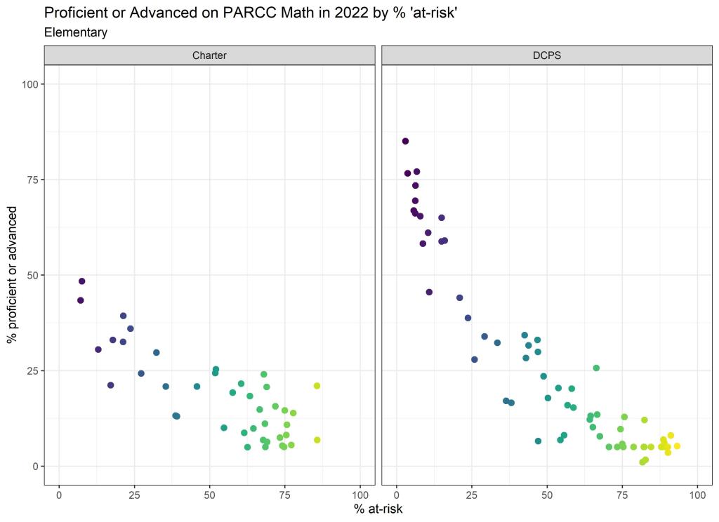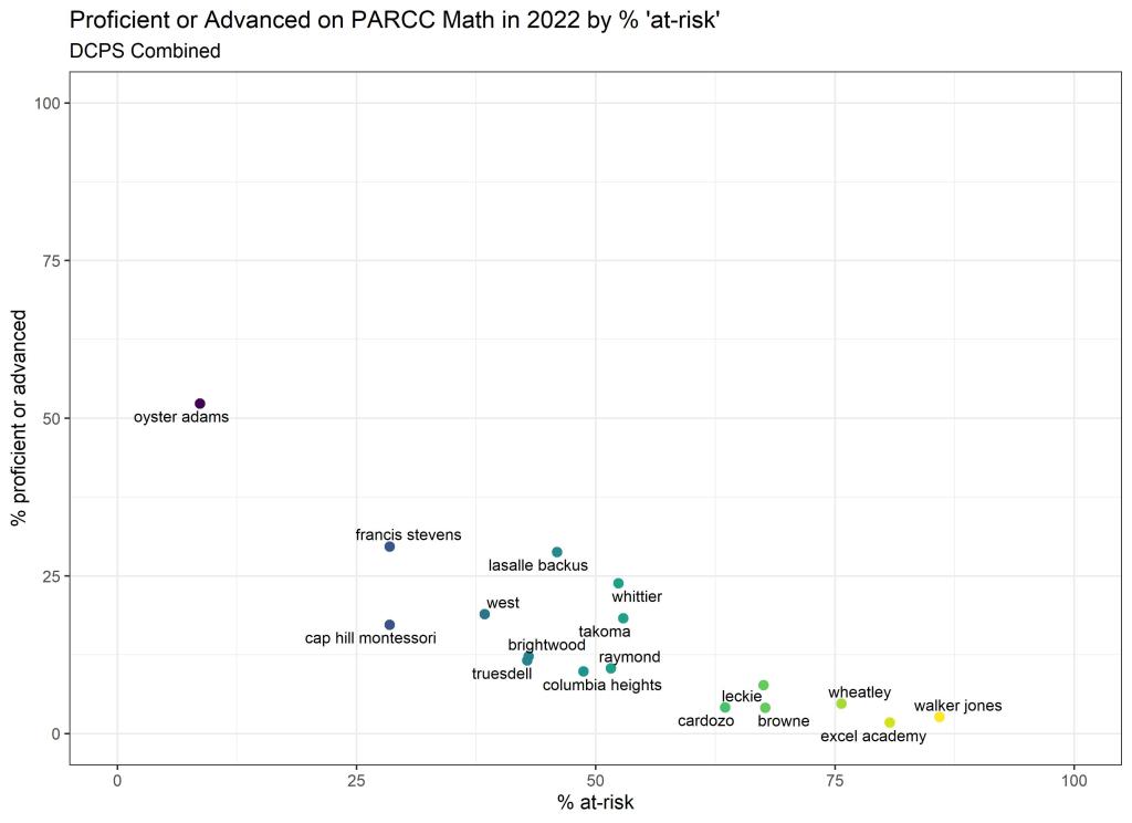 Below are graphs outlining the data by way of each school’s at risk percentages; these graphs were created by DCPS parent and education researcher Betsy Wolf and published with her permission. Her test score analysis, including these graphs, is here. As Wolf cautions, schools with low proficiency rates are not “bad”–and schools with high proficiency rates serve mainly students from households above the poverty line. As she notes, the graphs show that no school with more than half its students meeting the definition of at-risk has test results close to those of schools with wealthier students.
