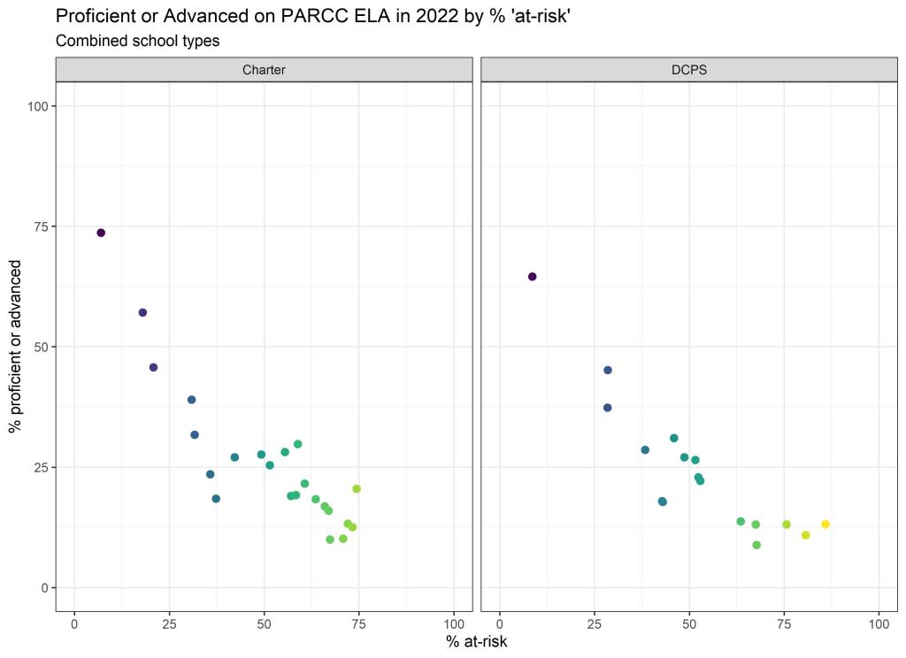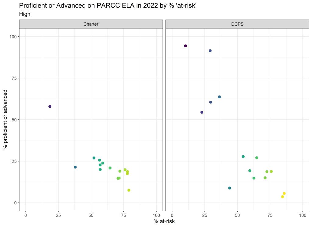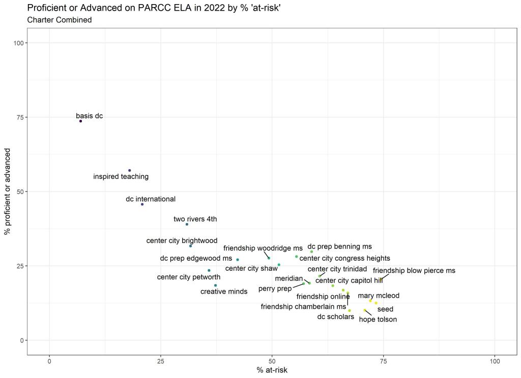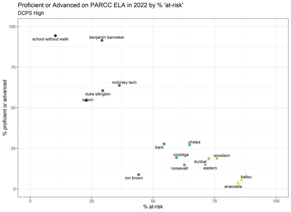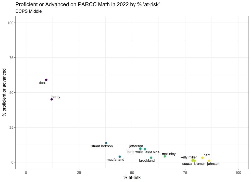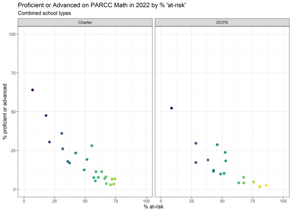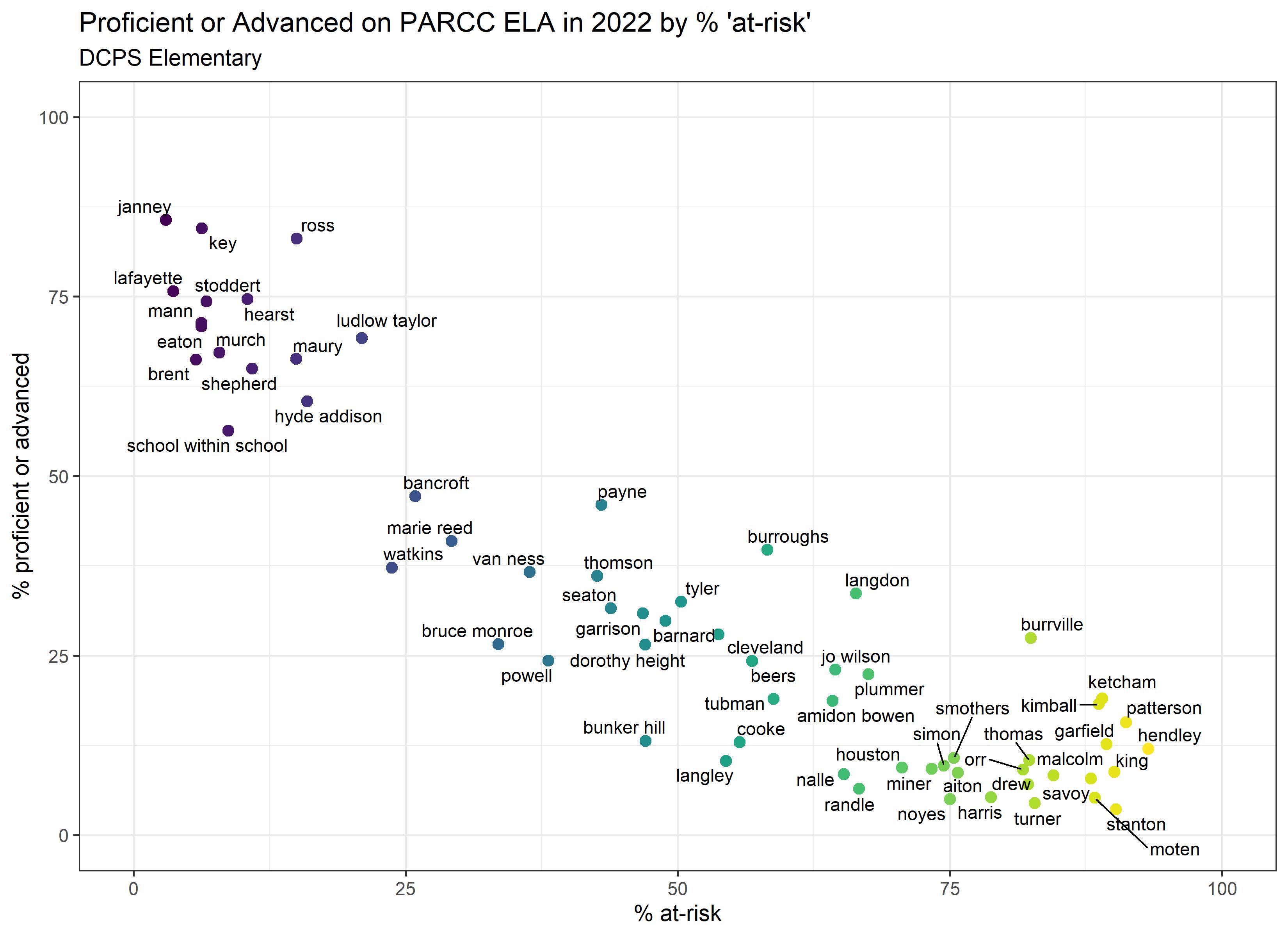 Below are graphs outlining the data by way of each school’s at risk percentages; these graphs were created by DCPS parent and education researcher Betsy Wolf and published with her permission. Her test score analysis, including these graphs, is here. As Wolf cautions, schools with low proficiency rates are not “bad”–and schools with high proficiency rates serve mainly students from households above the poverty line. As she notes, the graphs show that no school with more than half its students meeting the definition of at-risk has test results close to those of schools with wealthier students.