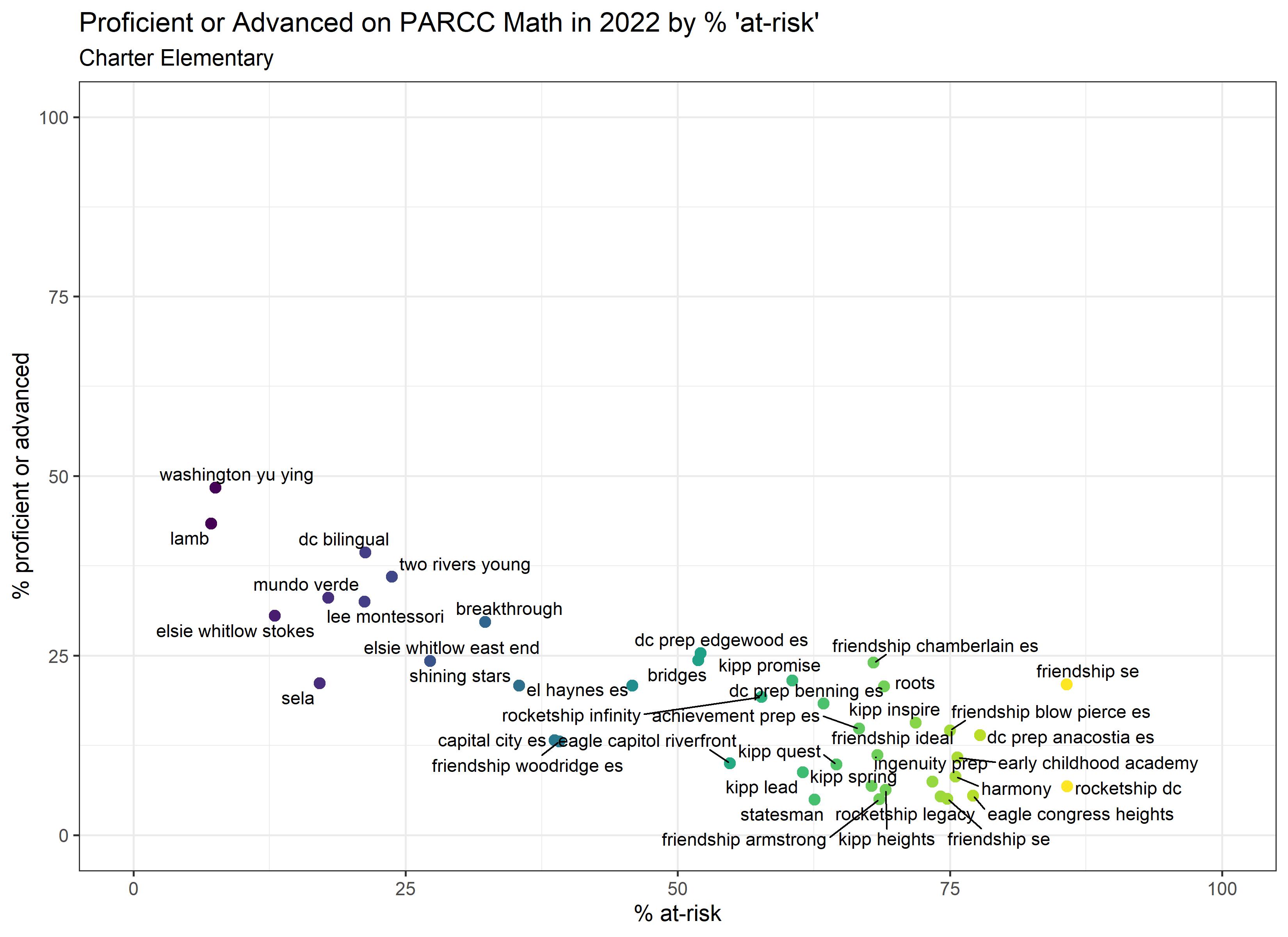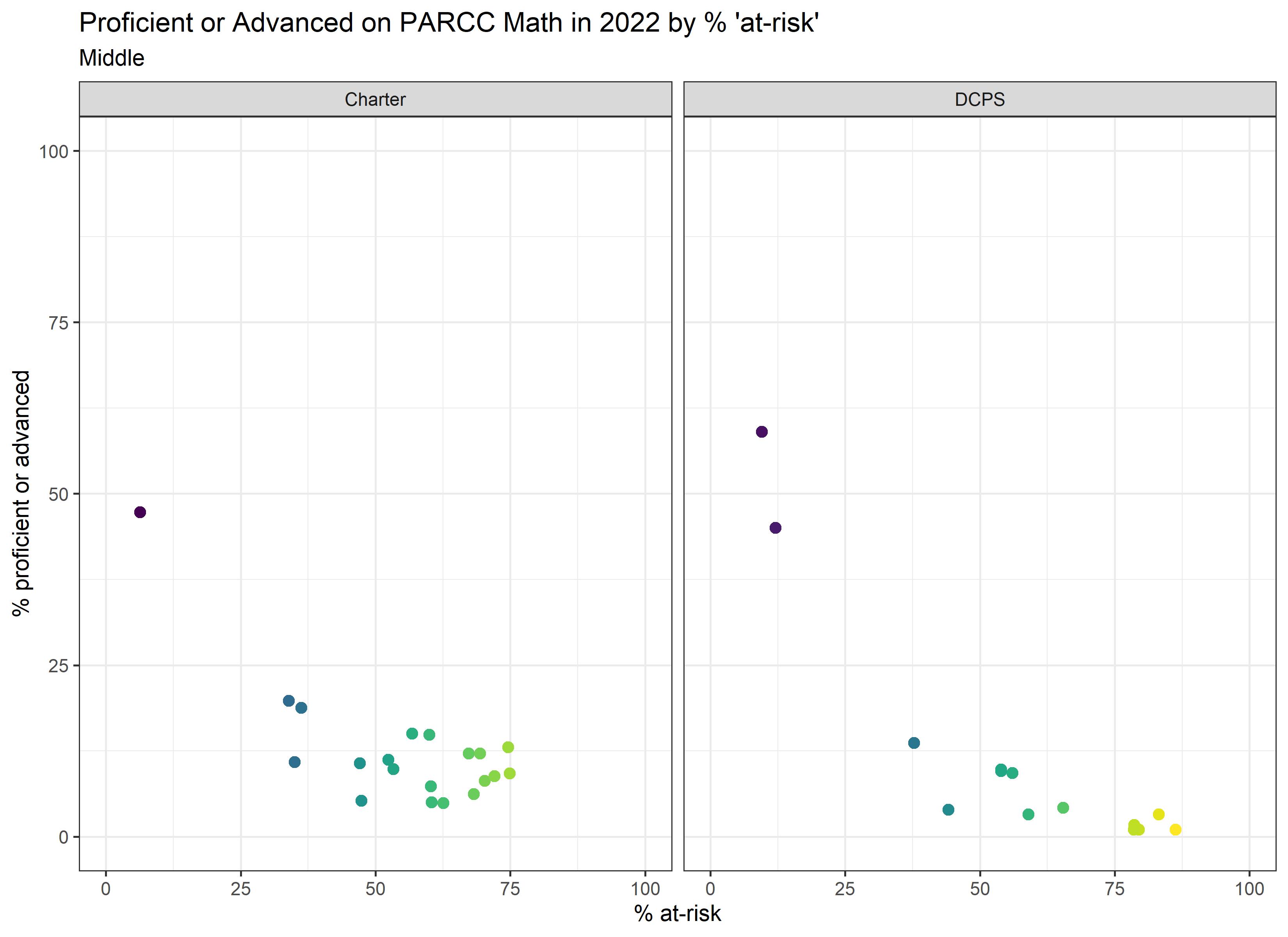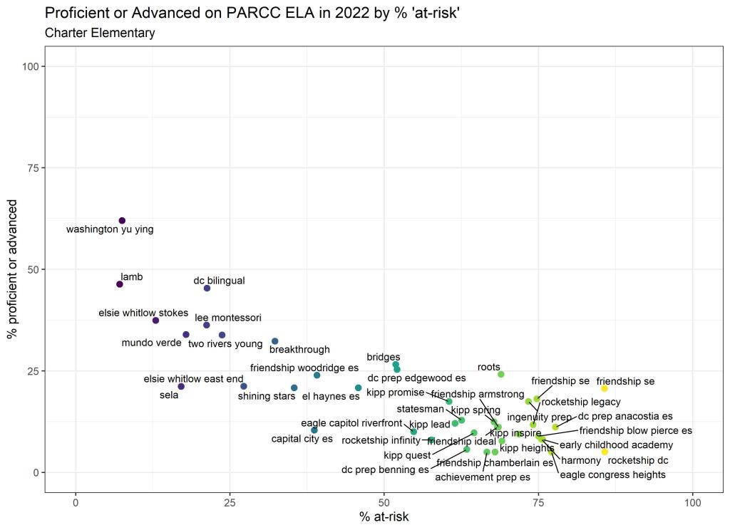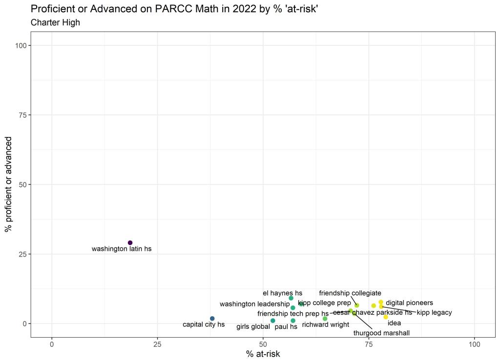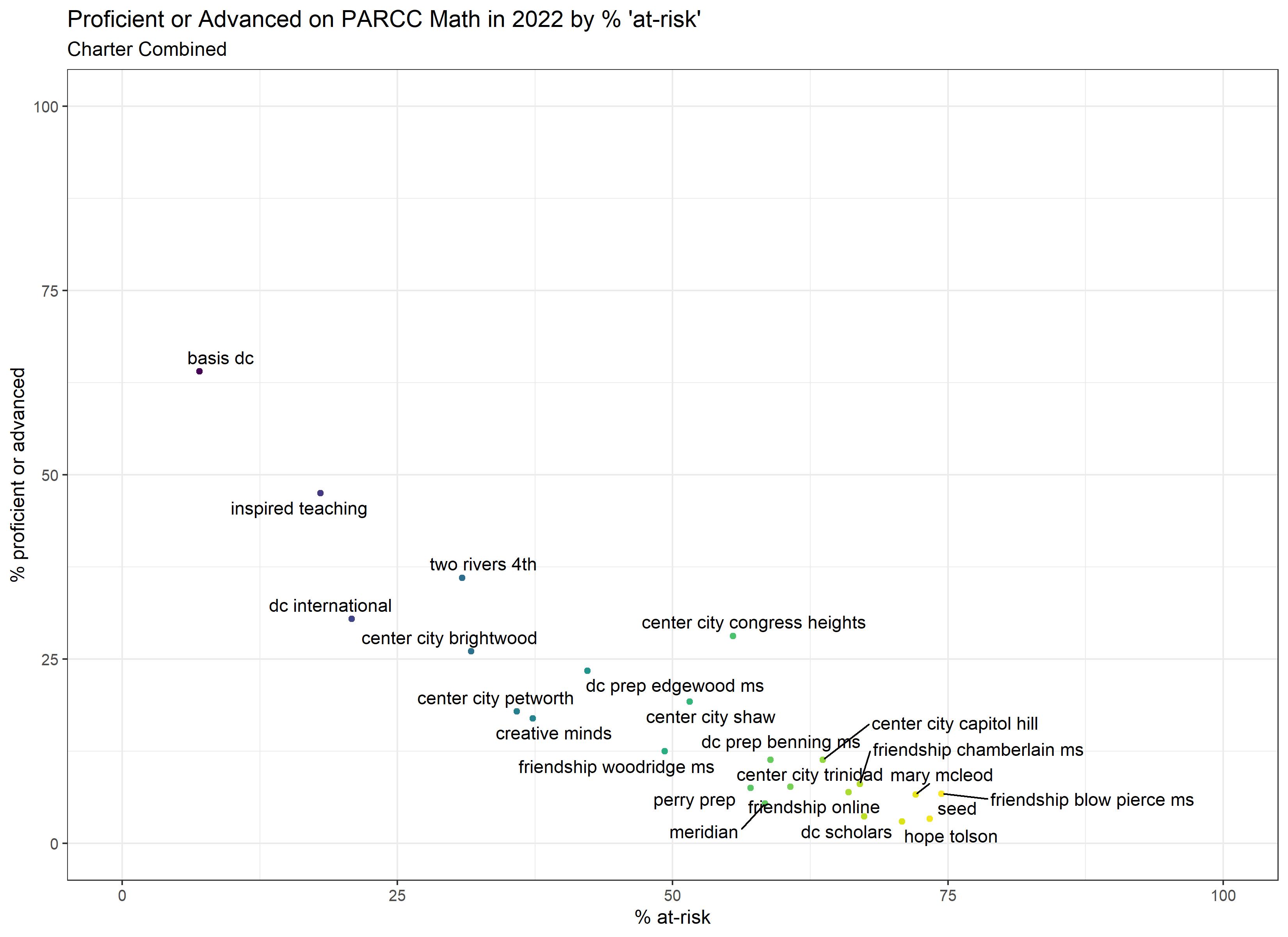 Below are graphs outlining the data by way of each school’s at risk percentages; these graphs were created by DCPS parent and education researcher Betsy Wolf and published with her permission. Her test score analysis, including these graphs, is here. As Wolf cautions, schools with low proficiency rates are not “bad”–and schools with high proficiency rates serve mainly students from households above the poverty line. As she notes, the graphs show that no school with more than half its students meeting the definition of at-risk has test results close to those of schools with wealthier students.