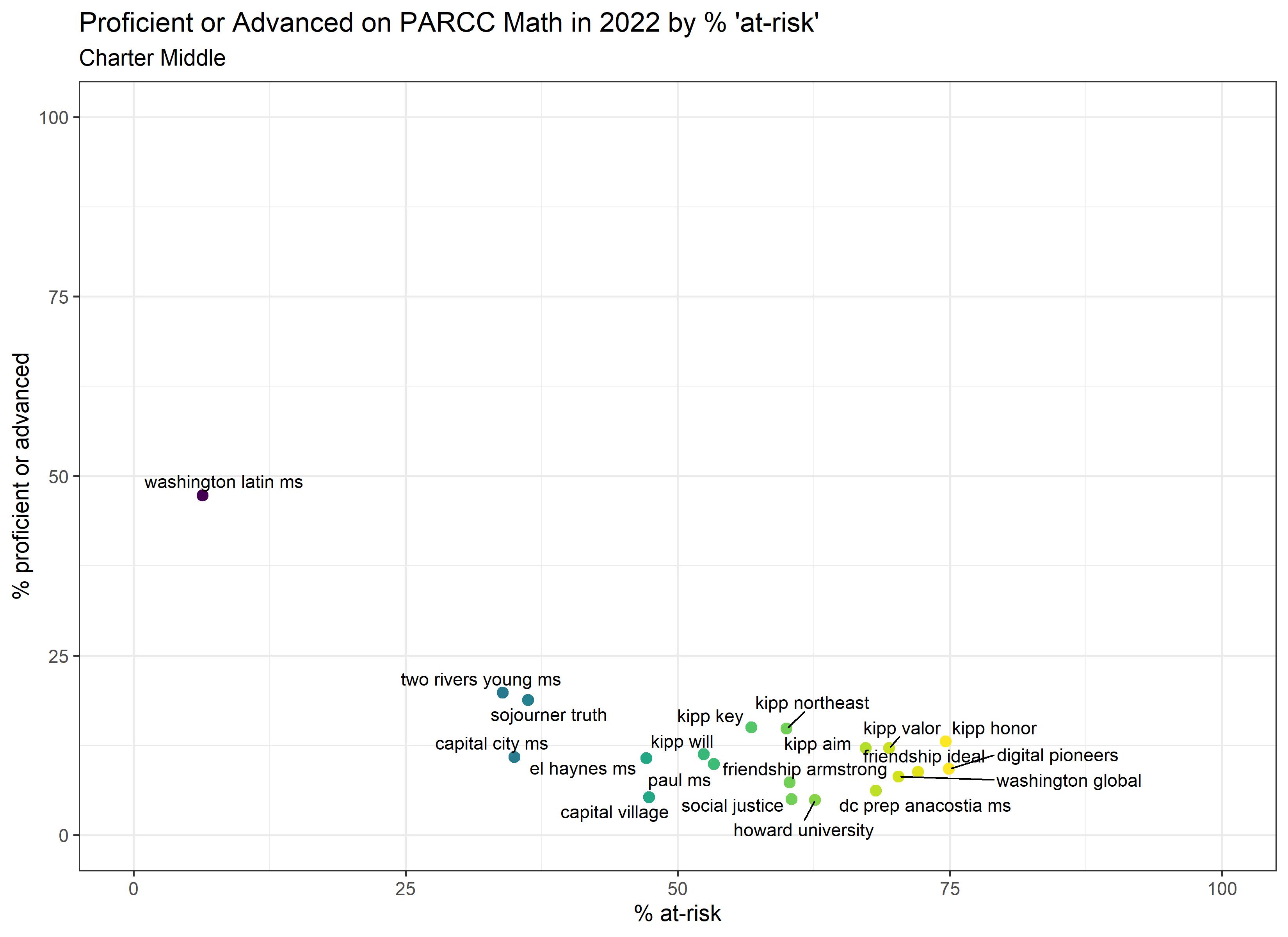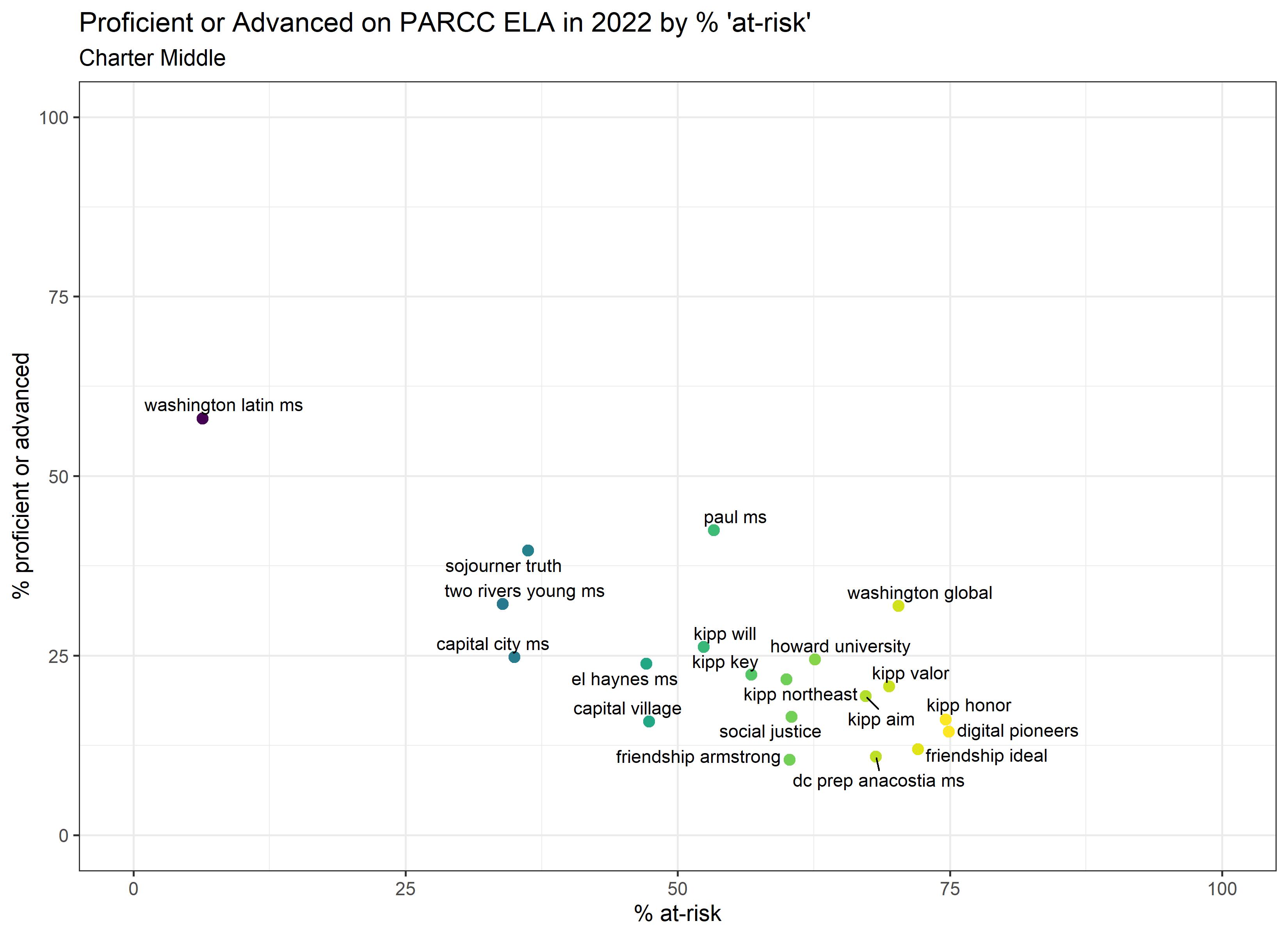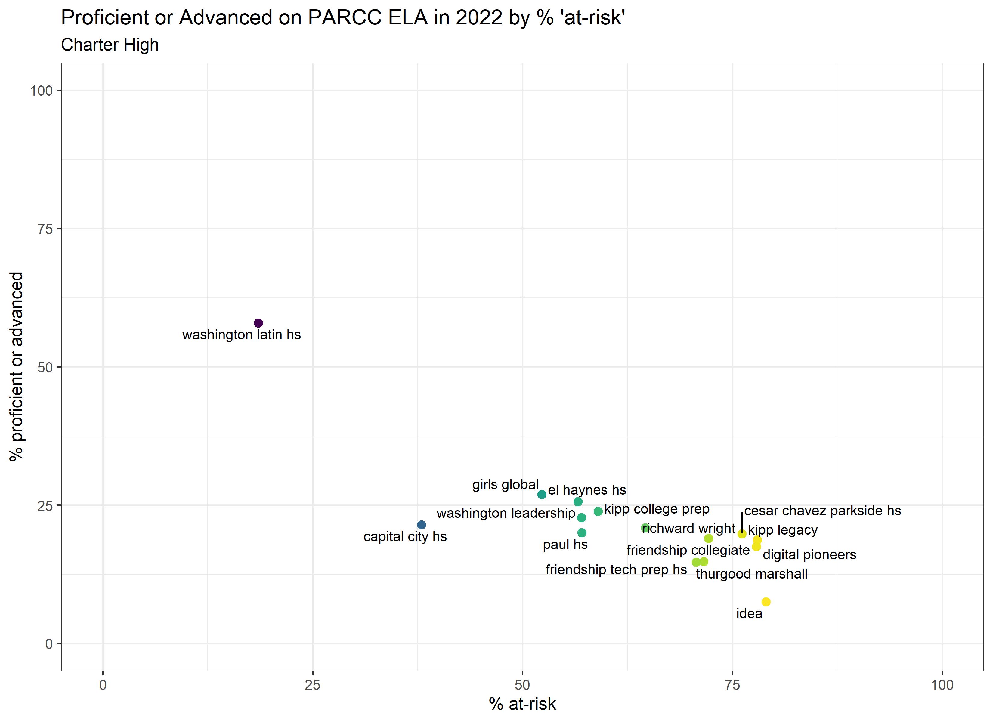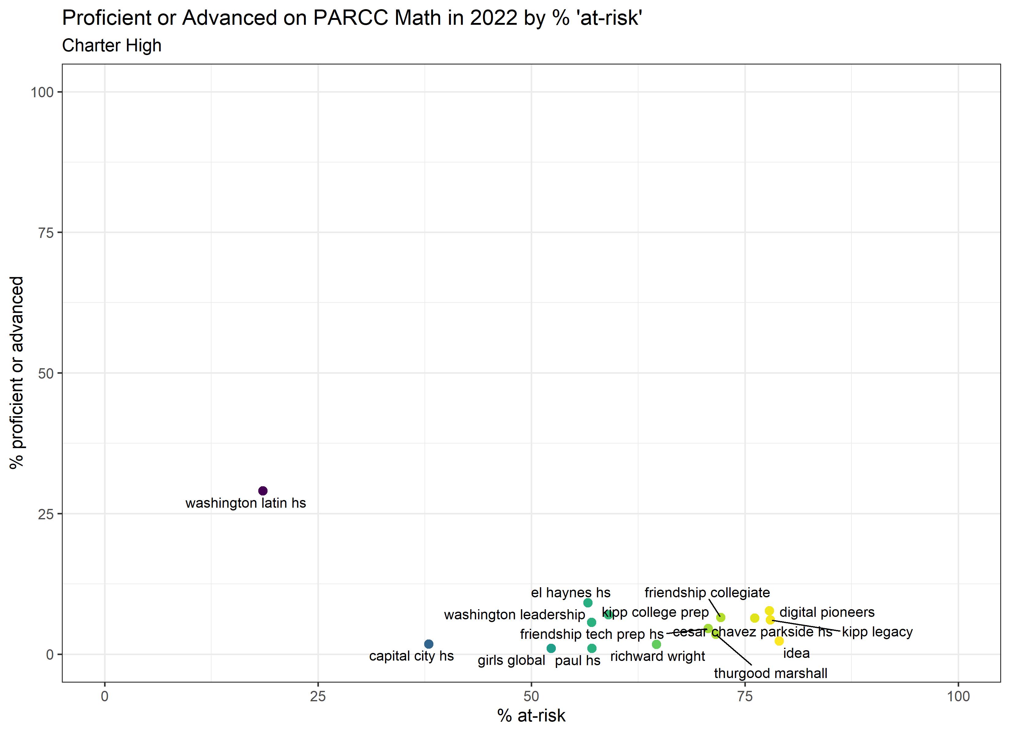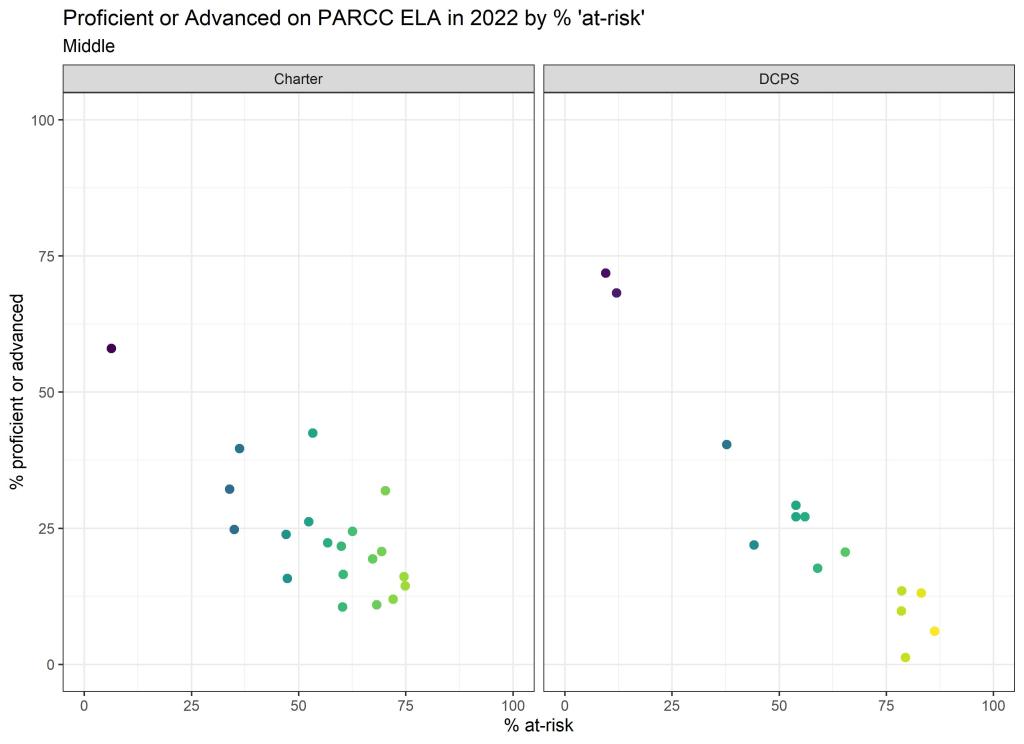 Below are graphs outlining the data by way of each school’s at risk percentages; these graphs were created by DCPS parent and education researcher Betsy Wolf and published with her permission. Her test score analysis, including these graphs, is here. As Wolf cautions, schools with low proficiency rates are not “bad”–and schools with high proficiency rates serve mainly students from households above the poverty line. As she notes, the graphs show that no school with more than half its students meeting the definition of at-risk has test results close to those of schools with wealthier students.