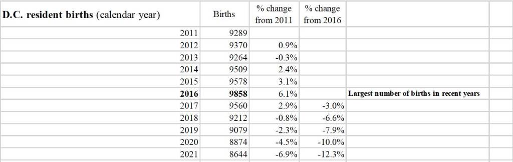 For one, in the wake of increasing school seats, DC’s births and kindergarten enrollment have decreased since 2016, with 2021 births the lowest since 2006 [footnote 2]: