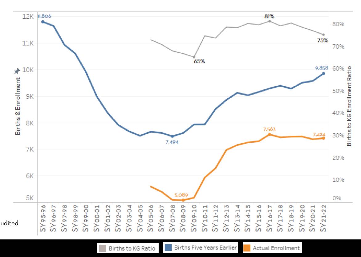 For one, in the wake of increasing school seats, DC’s births and kindergarten enrollment have decreased since 2016, with 2021 births the lowest since 2006 [footnote 2]: