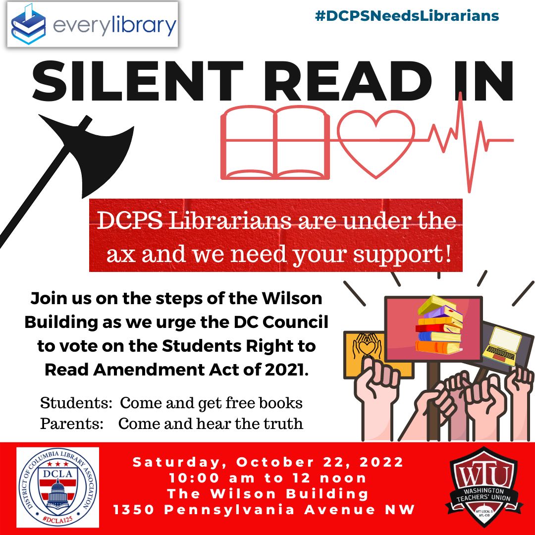 This coming Saturday, October 22, at 10 am, be sure to join DCPS librarians at a read-in at our city hall, the Wilson Building (1350 Pennsylvania Ave. NW), to protest the DC council not passing legislation that would provide a librarian for every DCPS school.