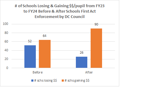 In response, the DC council rearranged the DCPS budget to move money and full-time employees out of the DCPS central office to bring all schools to at least the SFIB minimum. Some schools did lose money per pupil—mostly schools with few at risk students or very small enrollments that also received large amounts of extra money in the prior fiscal year (FY23).
