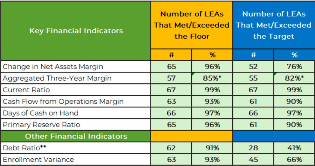 That January 10 table above also shows at least 23 LEAs not meeting a target for enrollment variance—while the table from p. 3 of the January 28 document suggests only 5 didn’t meet it. Ditto for LEAs not meeting the target for cash flow from operations margin nor the primary reserve ratio: the January 10 table has 7 LEAs not meeting those targets, while the January 28 table has 5 and 3, respectively.